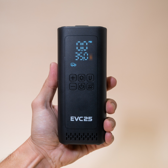 The EVC25 is an all-in-one air solution that’s perfect for your car, bike, motorcycle, or inflatables. This wireless compressor operates with 2 x 2000mAh batteries with capabilities of reaching 150 PSI. Multifunction with smart auto preset pressure, a digital screen, and large buttons. The EVC25 features multiple inflation modes and comes standard with a built-in power bank feature. Keep it in your glove box or under your seat - this portable tire inflator is a must-have for every vehicle.
